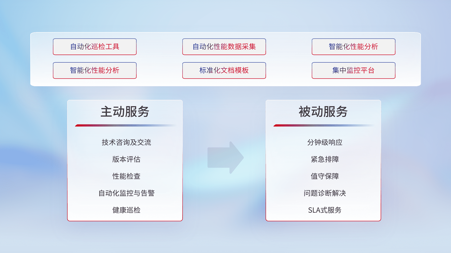 智能化工具和标准化文档,,,保障服务质量,,,,提供主动服务(包含技术咨询、、版本评估、、、、性能检查、、、、自动化监控与告警、、、健康巡检)和被动服务包含(分钟级响应、、、、紧急排障、、、值守保障、、问题诊断解决、、SLA服务)。。。