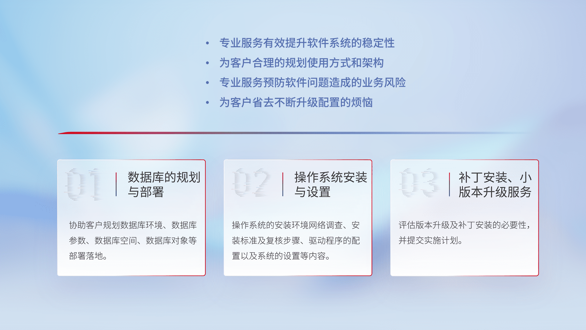 为客户提供软件规模升级、、、快速部署、、、、按需配置的专业服务,,从数据库的规划与部署到操作系统的安装与设置,,再到补丁安装和小版本升级提供支持。。。。